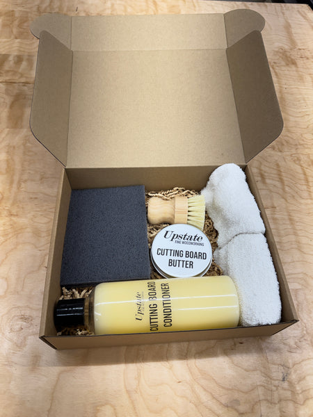 Everything you need to properly clean, condition, and protect your wooden kitchenware—all in one complete kit. The Upstate Fine Woodworking Cutting Board Care Kit is designed to keep your cutting boards, butcher blocks, countertops, and wooden utensils looking their best and lasting for years.