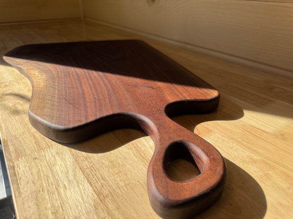 Sculpted from a single piece of premium American black walnut, this charcuterie board highlights rich, flowing grain and warm natural tones unique to the wood. Thoughtfully shaped with soft curves and a refined handle, it’s finished by hand to a smooth, food-safe sheen that feels as good as it looks. Designed to elevate everything from casual gatherings to formal entertaining—timeless, functional, and unmistakably heirloom-quality.